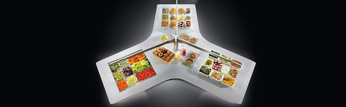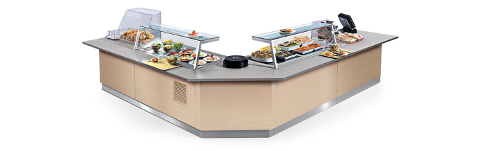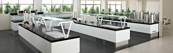 Innovativa isola a buffet di ampie dimensioni, progettata per soddisfare le esigenze di massima funzionalità di grandi strutture alberghiere coniugando praticità e stile contemporaneo.