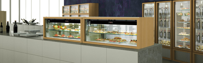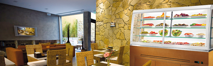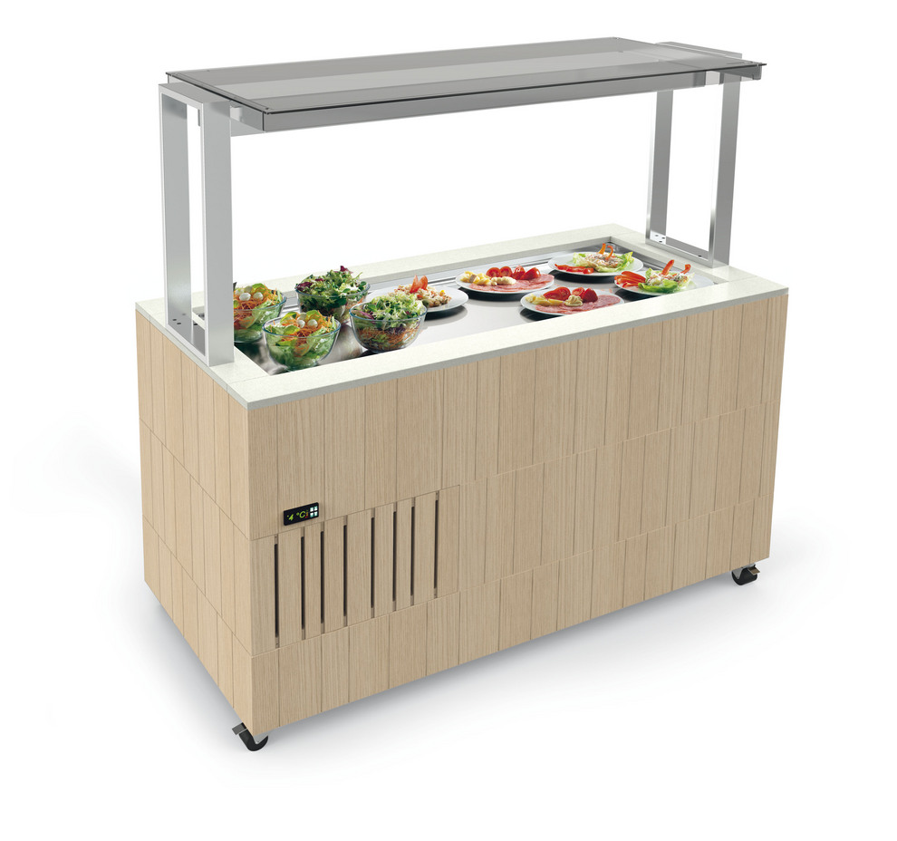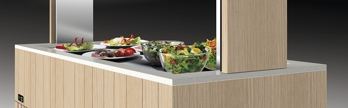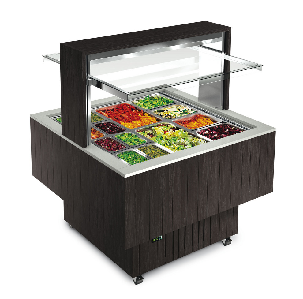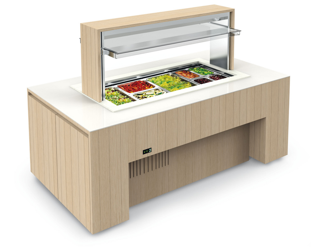 Il piano dell’isola viene illuminato da luci a led per mantenere inalterata la temperatura del cibo e favorire la migliore visibilità dei prodotti.