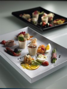Il Finger food è cibo mangiato con le mani, a differenza del cibo mangiato con un coltello e una forchetta, bacchette o altri utensili, ecco pertanto che segue regole proprie di realizzazione ed è di fondamentale importanza l’utilizzo di accessori appositi quali ad esempio piattini, bicchierini monoporzione, cialde contenitore, stecchetti colorati, posate monouso, alzate e scatole da esposizione.