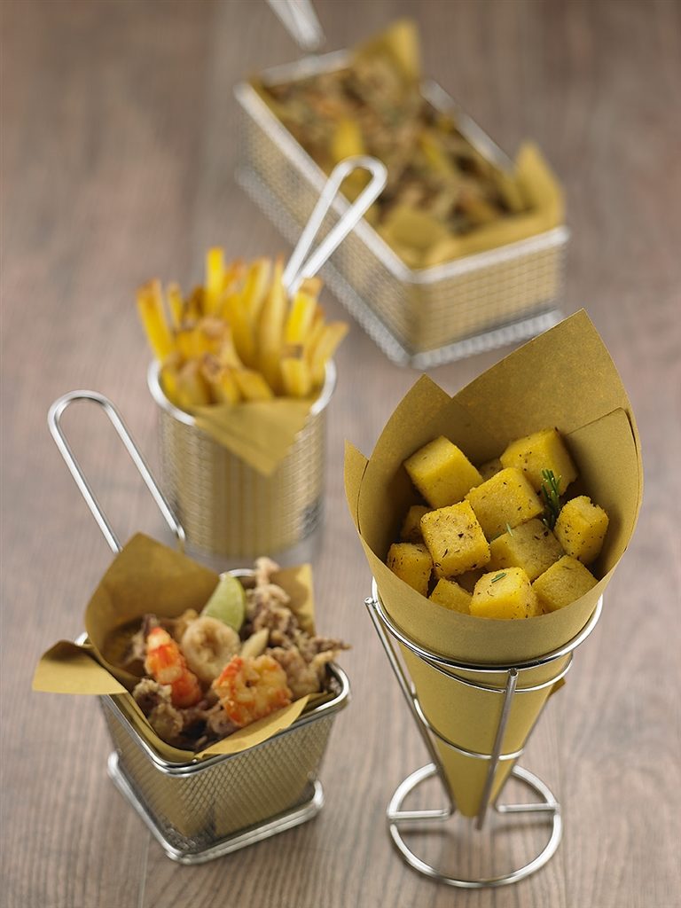 Il Finger food è cibo mangiato con le mani, a differenza del cibo mangiato con un coltello e una forchetta, bacchette o altri utensili, ecco pertanto che segue regole proprie di realizzazione ed è di fondamentale importanza l’utilizzo di accessori appositi quali ad esempio piattini, bicchierini monoporzione, cialde contenitore, stecchetti colorati, posate monouso, alzate e scatole da esposizione.